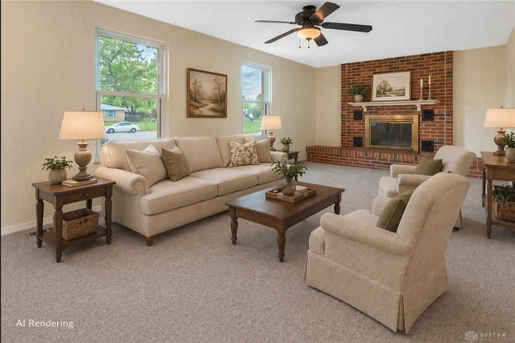 It's HOME! Incredible curb appeal with beautiful flowers welcome you home to 1,536 square feet with privacy fenced back yard, updated: dimensional shingle roof-2022, ultra high efficient, Carrier Furnace/AC/HP, Energy efficient windows & more! The low traffic street offers this 0.27 acre lot with gorgeous perennials welcoming you to this spacious circular floor plan. Appreciate the: new paint, new plush carpeting, smooth ceilings, large room sizes & natural light from insulated: Renewal by Anderson Windows. The large Family Room has a charming fireplace with brick hearth & mantle(owner never used). The Kitchen opens from the Dining with plenty of space for big gatherings with natural stained cherry Kraft-made high end cabinetry & French door refrigerator, Kitchen Aid Dishwasher & smooth top oven. Notice the buffet spacious pantry convenient laundry, powder room & storage. The upgraded patio door opens to the fenced back yard, cared for by Buckeye Ecocare turf with lush tree cover + a spacious shed + access to the 2 car - 25x20 garage. Upstairs, you'll love this double-sized primary Bedroom 22 x 11 with space for King-sized furniture, lounge/home office plus... 3 spacious closets! The Full Bath is convenient with natural light & upgraded shower tile. 2 Guest Bedrooms host spacious, mirrored closets + new plush carpeting, fans + insulated windows. High efficiency premium Carrier variable speed Furnace/AC/Heat Pump & Water Heater access... A $18,000 upgrade for your benefit 2020-2025(pumps), Roof- complete tear off 2022, gutters, leaf guards, rebuilt chimney from roofline, cap, Renewal by Anderson Windows 2016, Water Heater 2017, new driveway seal 4/2026. Located 1 mile from freeway, shopping, plenty of entertainment, schools & great parks + "The Rose" entertainment theater and only 5 Miles to Area A- WPAFB access & downtown Dayton. Occupancy at close! Don't miss out on this one! Call for the details.